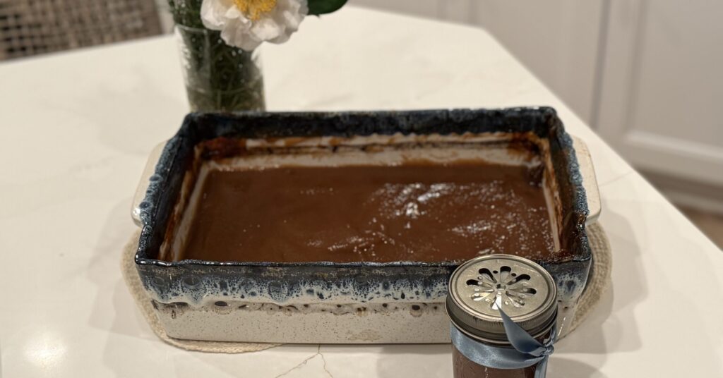 - Place the pot, uncovered, into the middle rack of your preheated oven. Cook, stirring every 30 minutes, until the mixture has significantly thickened and darkened in color, about 4 ½ – 5 hours.